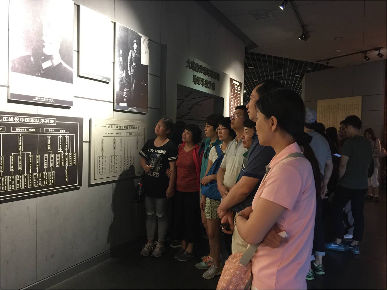 随后,一行人来到台儿庄大战纪念馆参观。台儿庄大战纪念馆坐落台儿庄古城西南。占地34000平方米,总建筑面积6000平方米。馆前三十八级台阶意味着一九三八年发生了震惊中外的中日台儿庄大战;二十四根立柱支撑着白色天棚,象征着中华民族顶于立地,永远屹立于世界民族之林;纪念馆馆名由着名书法家启功先生题写;主体建筑物前方矗立着台儿庄大战纪念碑,碑名由原国防部部长张爱萍将军题写,碑文由全国人大常委会副委员长程思远撰文、着名书法家权希军书写。整个纪念馆融展览馆、书画馆、影视馆、全景画馆为一体,气势雄伟,庄严肃穆。展览馆共有三个展室,建筑面积1400平方米,馆内陈列着台儿庄大战时中日双方资料、文物千余件,书画馆珍藏着参战将士和亲属以及着名书画家、政界人士的书画作品近千件。影视馆播放当年战地记者拍摄的珍贵纪录片、参战将士访谈录及影片《血战台儿庄》。全景画馆是我国唯一一家以抗战为题材的大型全景画馆,它是18边形的筒式建筑,高28米,直径43米,建筑面积3100平方米,《血战台儿庄》全景画馆包括绘画、地面塑型、灯光、音响和解说五个部分,将历史真实与艺术真实融为一体,生动地再现了中国军队在台儿庄以阵地战迎击日军,浴血奋战,直到取得胜利的历史过程。台儿庄大战是抗日战争初期中国军队继平型关大捷后的又一重大胜利,这场战役,历经月余,歼敌万余,创八年抗战之伟绩,扬中华民族之雄威。毛主席在《论持久战》中说:“每个月打得一个较大的胜战,如平型关、台儿庄一类的,就能大大地沮丧敌人的精神,振起我军的士气,号召世界的声援。”